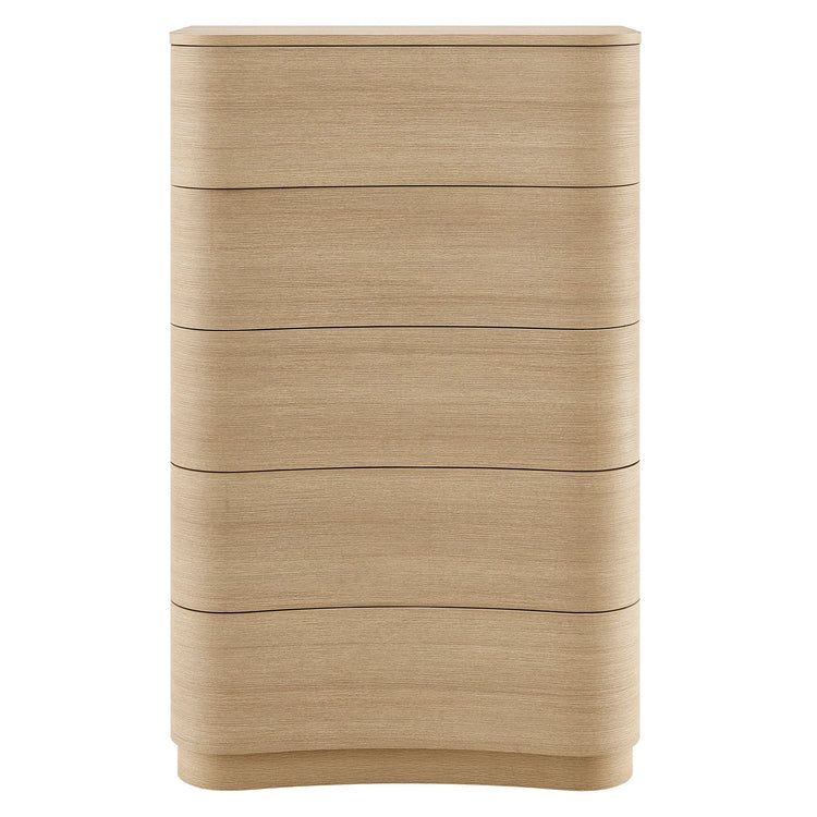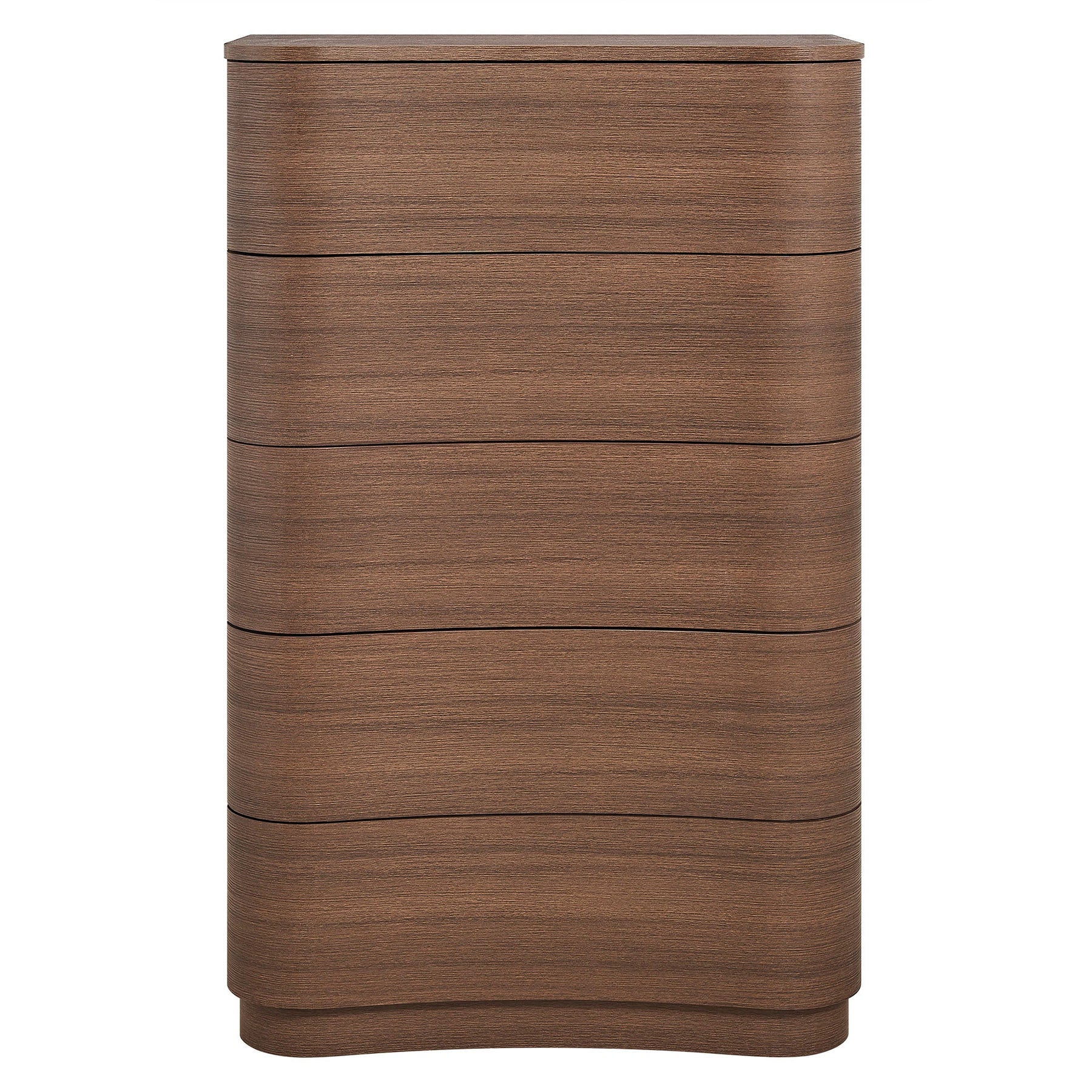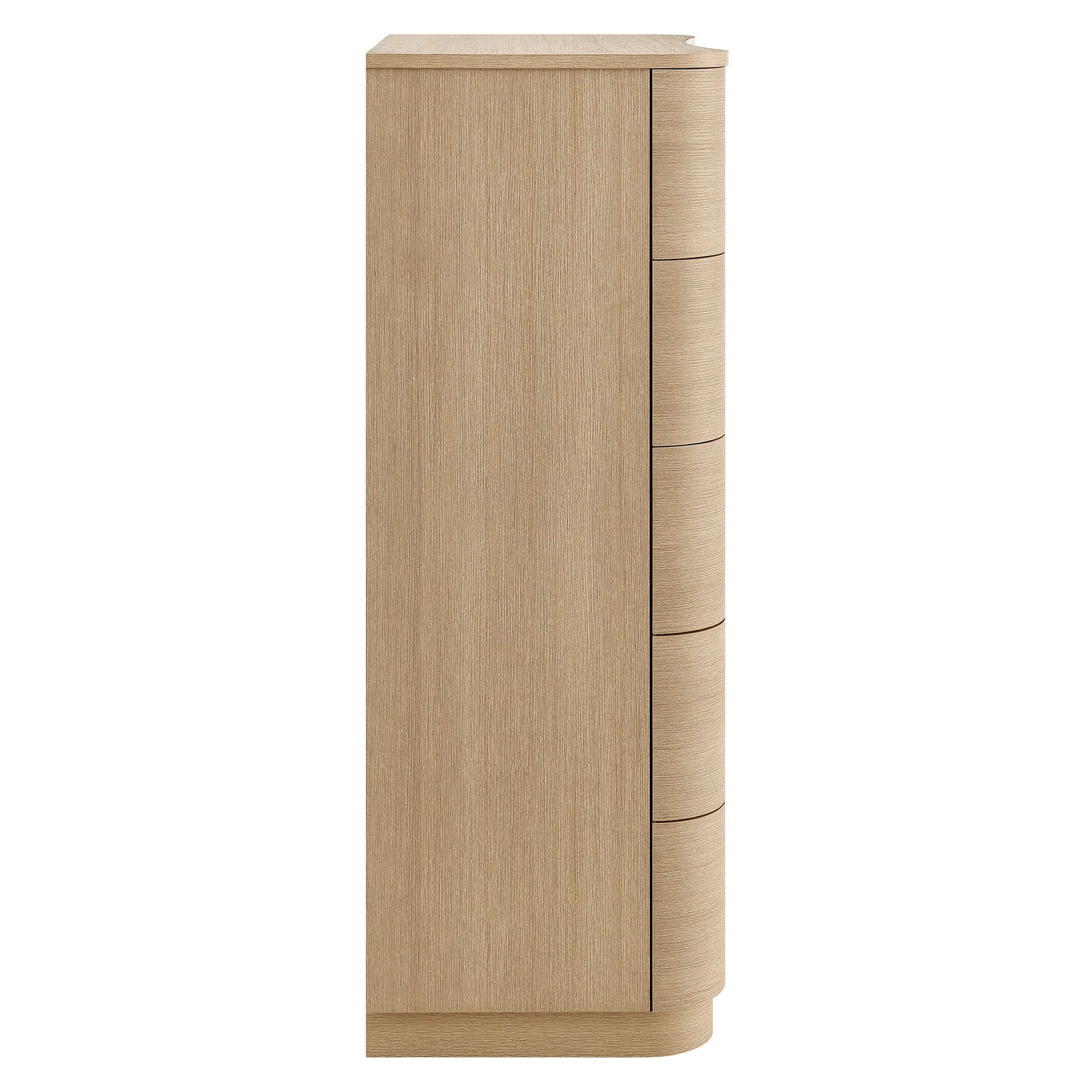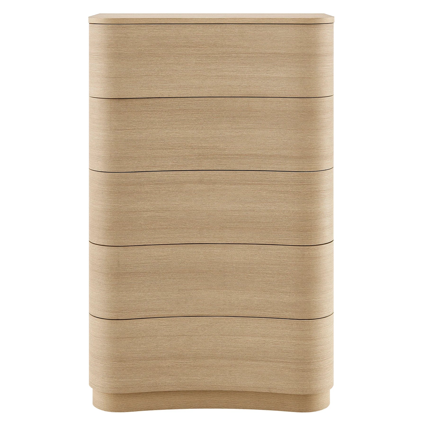 Las líneas esculturales y el almacenamiento vertical convierten a la cómoda Bruno de 5 cajones en una pieza excepcional para el dormitorio moderno. Diseñada con una estructura alta y frentes de cajón elegantemente curvados, esta cómoda vertical aporta suavidad y fluidez visual a cualquier espacio. El laminado de madera de veta lisa resalta la forma natural, mientras que sus cinco cajones amplios y profundos ofrecen gran capacidad para ropa, ropa de cama o artículos esenciales de uso diario. Ya sea como cómoda alta en el dormitorio, armario o cómoda vertical en un pasillo o habitación de invitados, combina belleza y funcionalidad en un perfil estilizado. Requiere montaje.