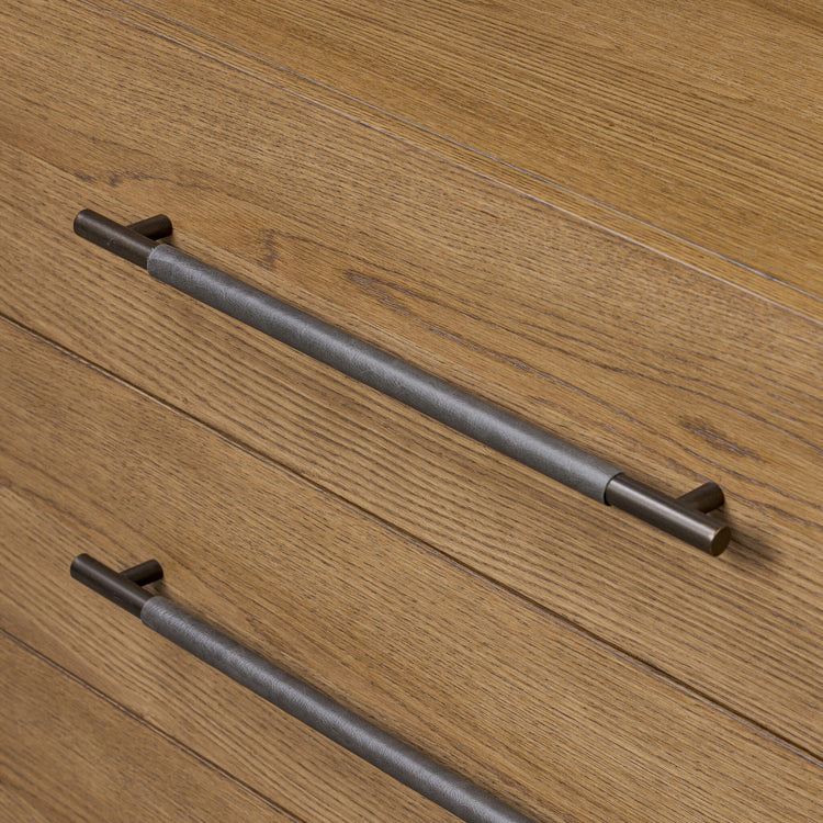 El roble con acabado claro crea una silueta limpia en seis amplios cajones con herrajes de hierro forjados en piel flor color canela. Este artículo ha sido modificado para cumplir con la Ley STURDY..