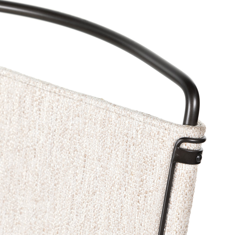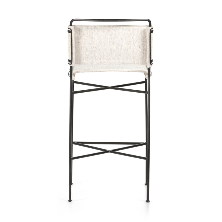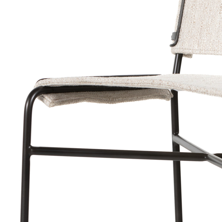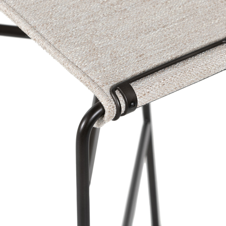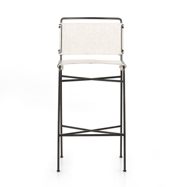 Las líneas delgadas y los materiales mixtos se combinan para brindar una amplia comodidad en la barra. Con un acabado en negro azabache encerado, los tubos de hierro de inspiración arquitectónica se adornan con asientos de algodón contorneados simplemente en un versátil color blanquecino.
