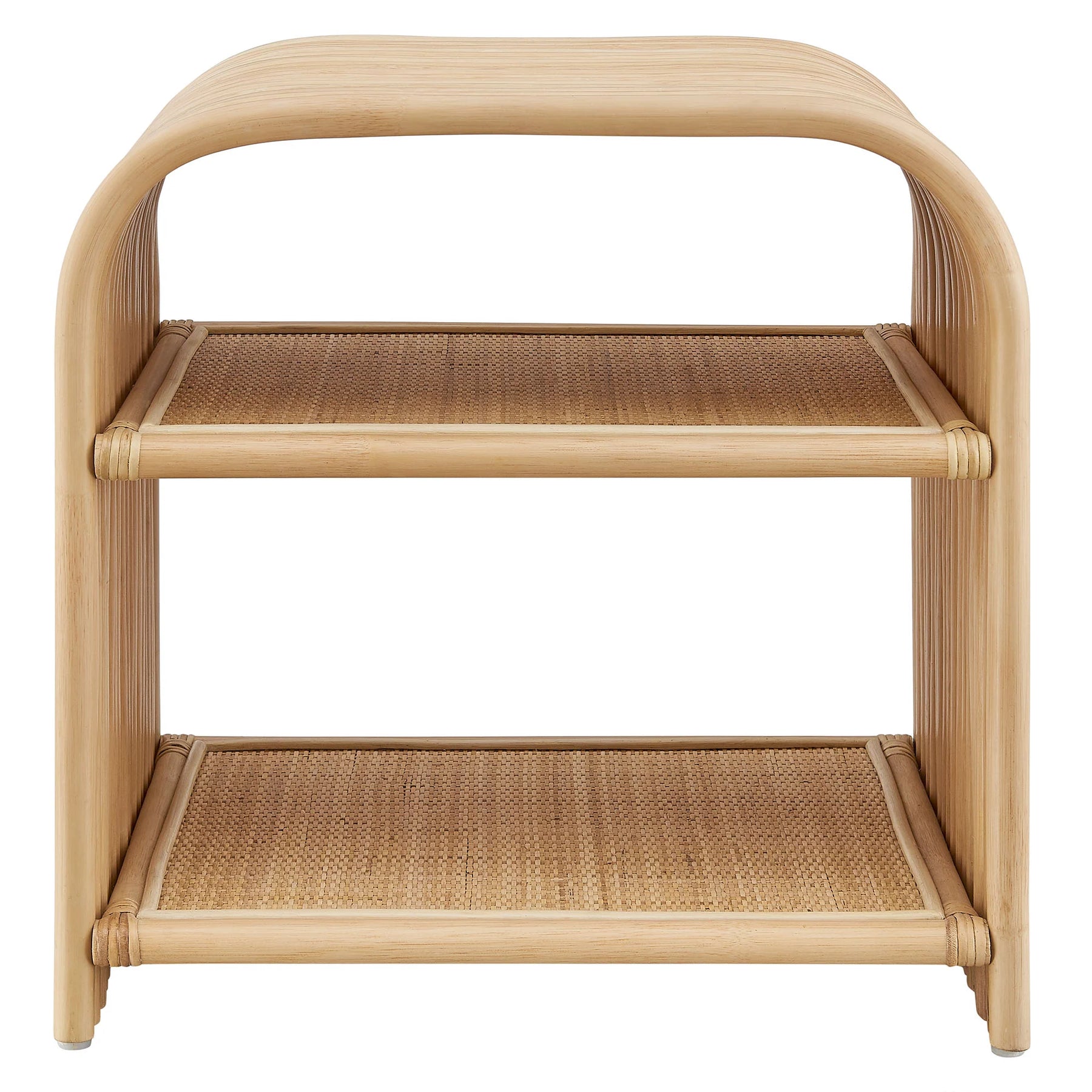 Añade un toque relajado a tu espacio con la mesa auxiliar curva Laziel de ratán natural. Con un perfil redondeado y una silueta ligera, esta amplia mesa auxiliar o mesita de noche está elaborada con ratán natural tejido con líneas curvas para un estilo orgánico y desenfadado. Un estante fijo ofrece espacio para guardar libros, velas u otros objetos pequeños, mientras que las patas con protectores antideslizantes ayudan a proteger los suelos de madera o baldosas. Perfecta junto a un sillón de lectura, en una terraza acristalada o incluso en un patio cubierto, llega completamente montada y lista para aportar estilo y funcionalidad dondequiera que la coloques. Nota del producto: Debido a las características naturales del ratán, es normal que existan ligeras variaciones en el color y el patrón, lo que añade un carácter único a cada pieza.