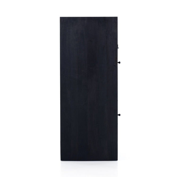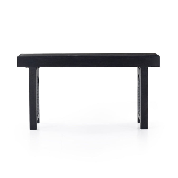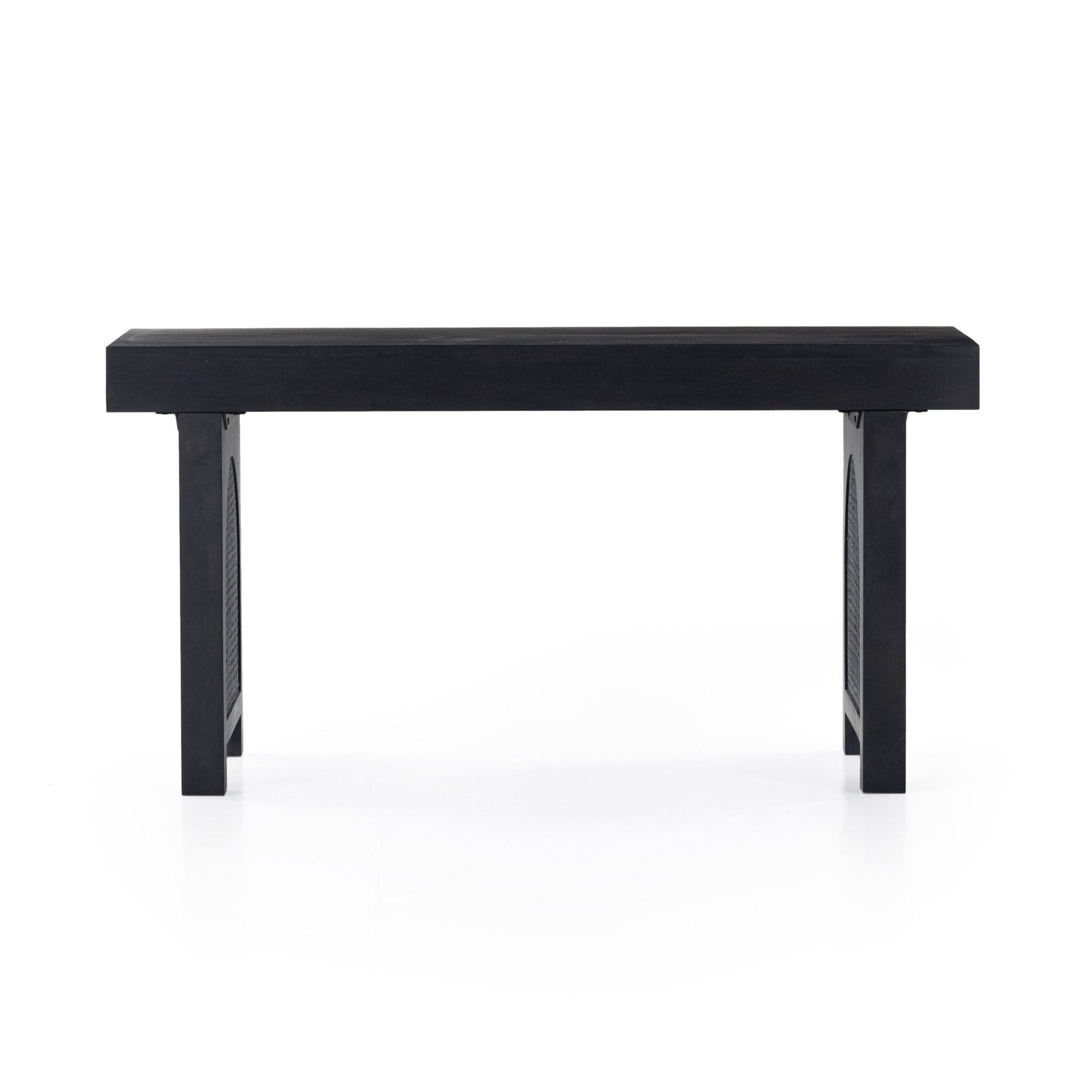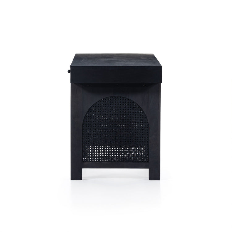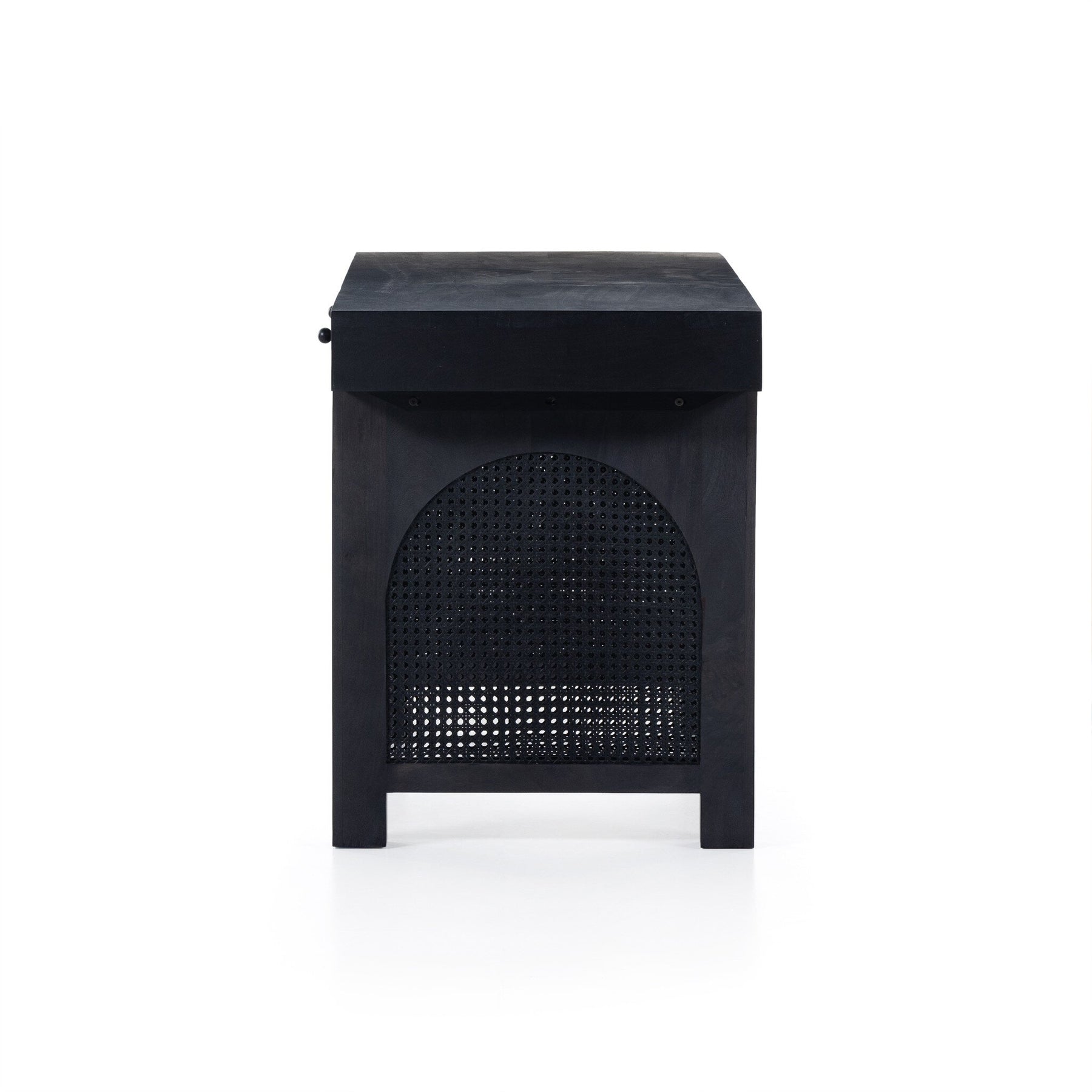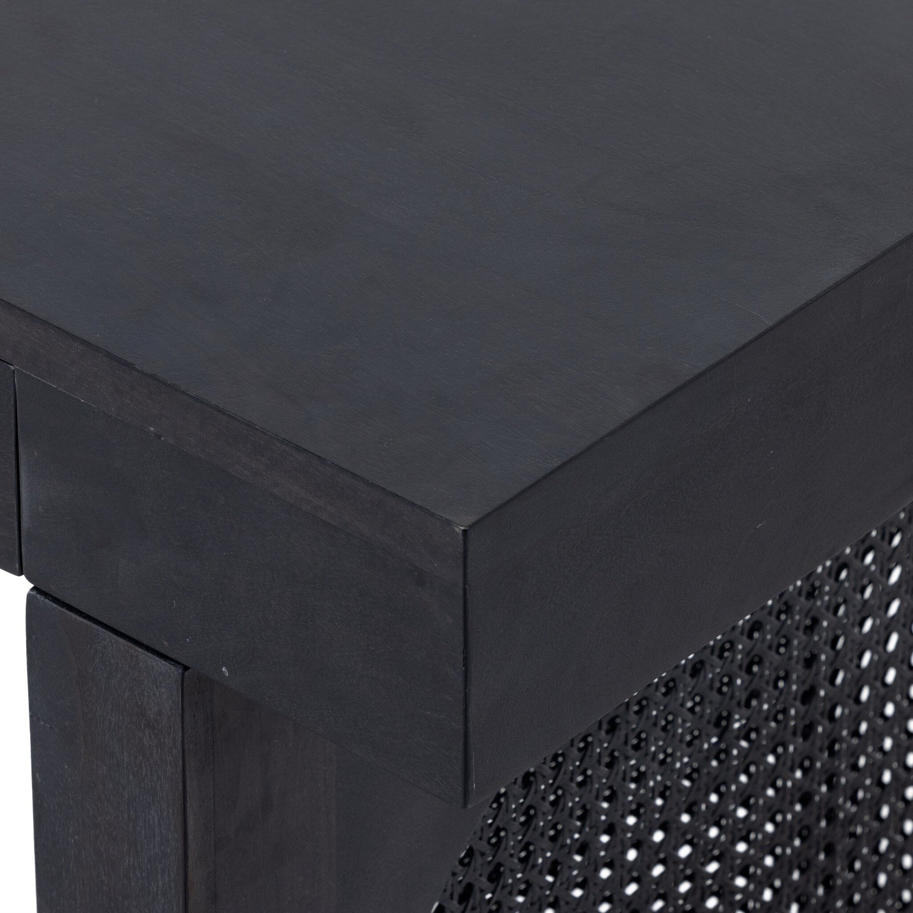 El mango lavado en negro encierra paneles de puerta de caña texturizada con herrajes de hierro con acabado negro, combinando una innovadora combinación de materiales con elegantes toques monocromáticos. Los cajones dobles mantienen los materiales de oficina de uso frecuente a mano.