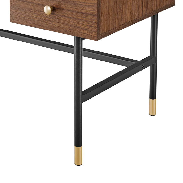 Concéntrese en la tarea que tiene entre manos en medio del estilo moderno y el diseño funcional del escritorio de oficina. Elaborado con tableros de partículas y papel laminado que cuenta con un hermoso diseño de vetas de madera, este escritorio para computadora aporta una estética orgánica a su espacio de trabajo. El elegante marco tubular de metal está acabado con detalles dorados para darle un toque elegante. Este escritorio de oficina en casa se completa con dos cajones de deslizamiento completo para guardar los elementos esenciales de la oficina, mientras que la mesa espaciosa brinda mucho espacio para relajarse durante la jornada laboral. Con un aspecto atemporal y un diseño funcional, este escritorio es un complemento elegante para una oficina en casa, un dormitorio universitario o un dormitorio extra. Se requiere ensamblaje. Capacidad de peso: 200 libras.